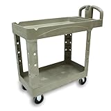 | ✚✚✚ RUBBERMAID Heavy-Duty Tray-Shelf Carts - Beige Ships unassembled to save freight costs-universal uprights make set up quick and easy. RUBBERMAID Heavy-Duty Tray-Shelf Carts handle both industrial and commercial loads. Structural foam construction includes a leakproof top with rounded corners to protect walls, furniture, and equipment. Top shelf will accommodate hook-on utility basket (sold separately). Handle includes built-in tool storage and cup holder. All carts include two shelves. 331/4"H overall. New improved features have taken the already reliable RUBBERMAID Heavy-Duty Tray-Shelf Cart and made it even better. The higher, more ergonomically shaped handle includes cord hooks, a drill/mallet rest, and tool slots. The top shelf has two V-notches to hold long tubes in place. Legs are punched with 3/4" dia. holes to thread rods through for storing rolled material or reels. All carts include two shelves. 331/4"H overall. Still lightweight and easy to maneuver on 2 fixed and 2 swivel non-marking casters. 30x16x33 1/4"H, has a 500 lbs cap, & 5" rubber wheels.NOTE: Standard style carts are still available, while quantities last.